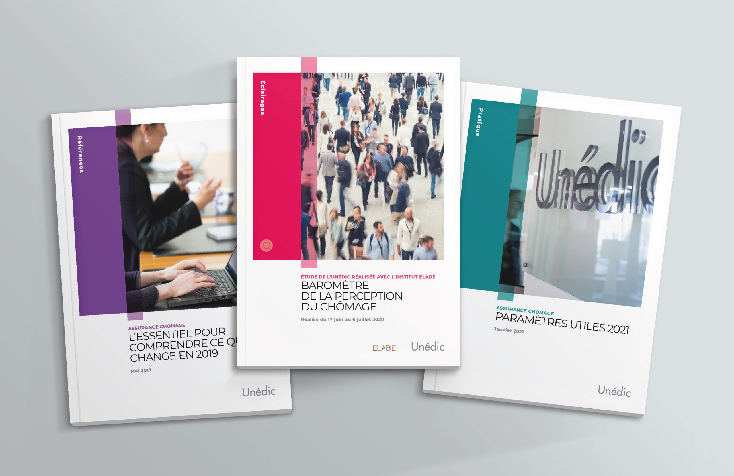 Conception graphique et réalisation du rapport annuel 2019 de l’Unedic. (Illustrations : David Despau)